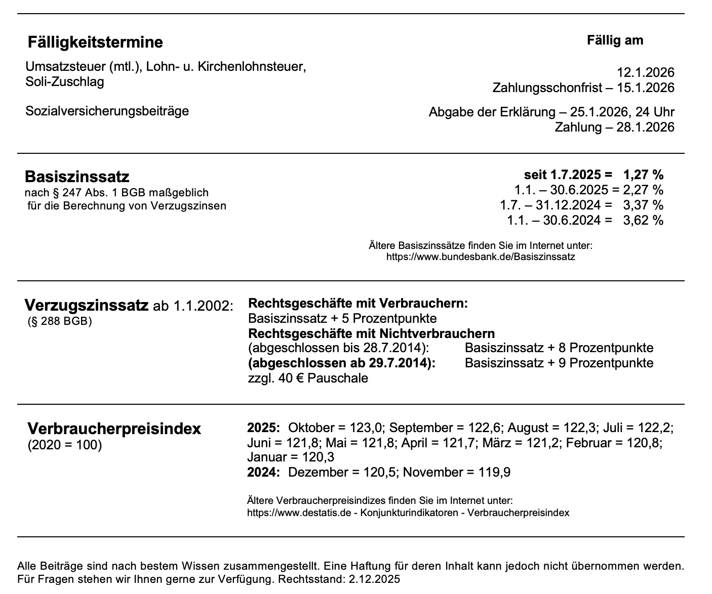 Warnhinweis: Gefälschte Rechnungen mit Zahlungsaufforderung im Umlauf, die nicht vom Bundeszentralamt für Steuern (BZSt) stammen Plan der Bundesregierung: Erst Sonderabschreibungen für Unternehmen ab 1.7.2025 – dann KSt-Senkung BFH: Zurechnungsbesteuerung für Stiftungen nach dem Außensteuergesetz ist europarechtswidrig BMF-Schreiben zum Sonderausgabenabzug für Vorsorgeaufwendungen bei steuerfreien Auslandseinkünften Was Mandanten wissen sollten – Anpassung der Steuerberatervergütung ab 1.7.2025 Erlass von Säumniszuschlägen setzt kein gerichtliches Verfahren zur AdV voraus Sommerhitze am Arbeitsplatz Ex-Geschäftsführer genießt wieder Kündigungsschutz GmbH-Geschäftsführer – Beurteilung der Sozialversicherungspflicht Haftung – Badeunfall durch regelwidrige Nutzung einer Wasserrutsche Prüfpflichten eines Hostproviders Veränderungen an der Statik sind dem Käufer mitzuteilen Wohnen in einer WG – keine Kürzung des Selbstbehalts beim Unterhaltspflichtigen Fahrverbot wegen Tempoverstoß – Ausrede mit angeblich unklarer Beschilderung scheitert